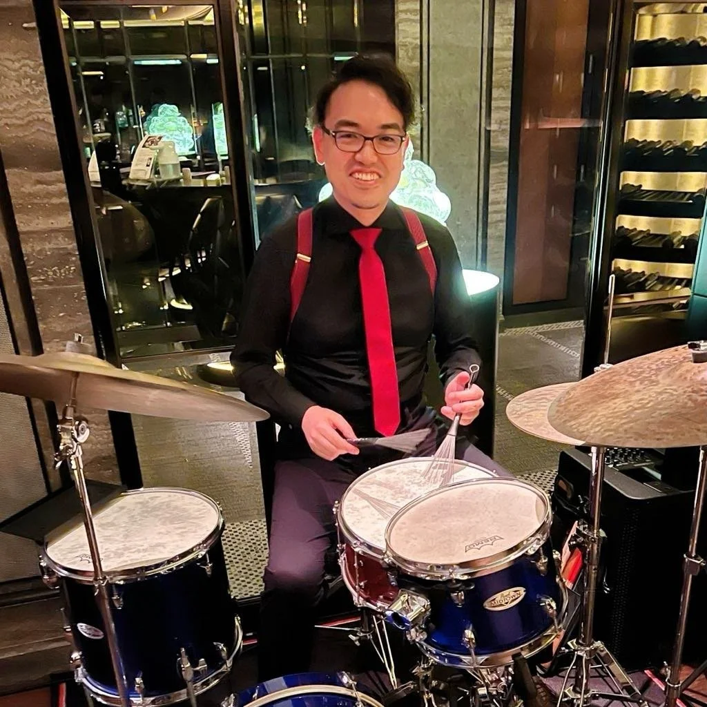 I started playing the piano at the age of 4, then switched to the flute at 12, continuing until I graduated from high school. At 15, I discovered the drums through the brass band club. After that, I joined a jazz club in college and began working professionally while still a student. Currently, I am the leader of a regular band at a luxury hotel, performing primarily jazz for both domestic and international guests at the bar.